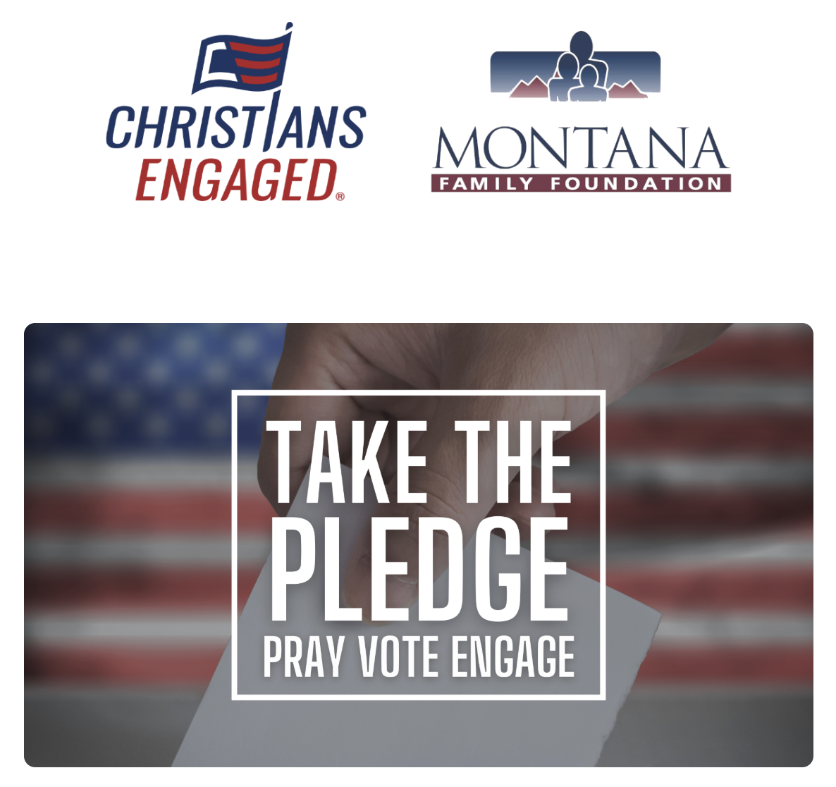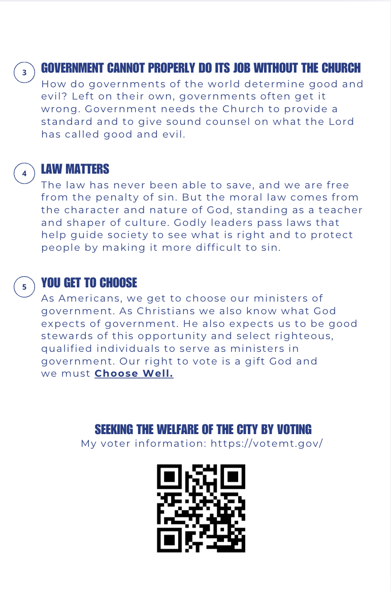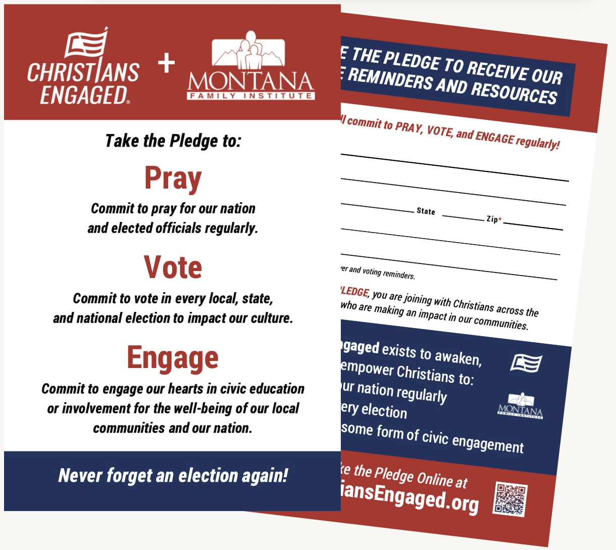 For those who want to become involved in the political process and issue advocacy, join the Christians Engaged team of the Montana Family Institute. Signup handout cards are available.